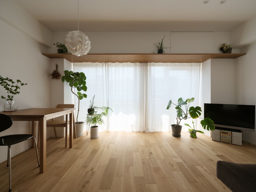 設備を見せないことで、壁が背景として機能し、家具や素材の表情を引き立てます。