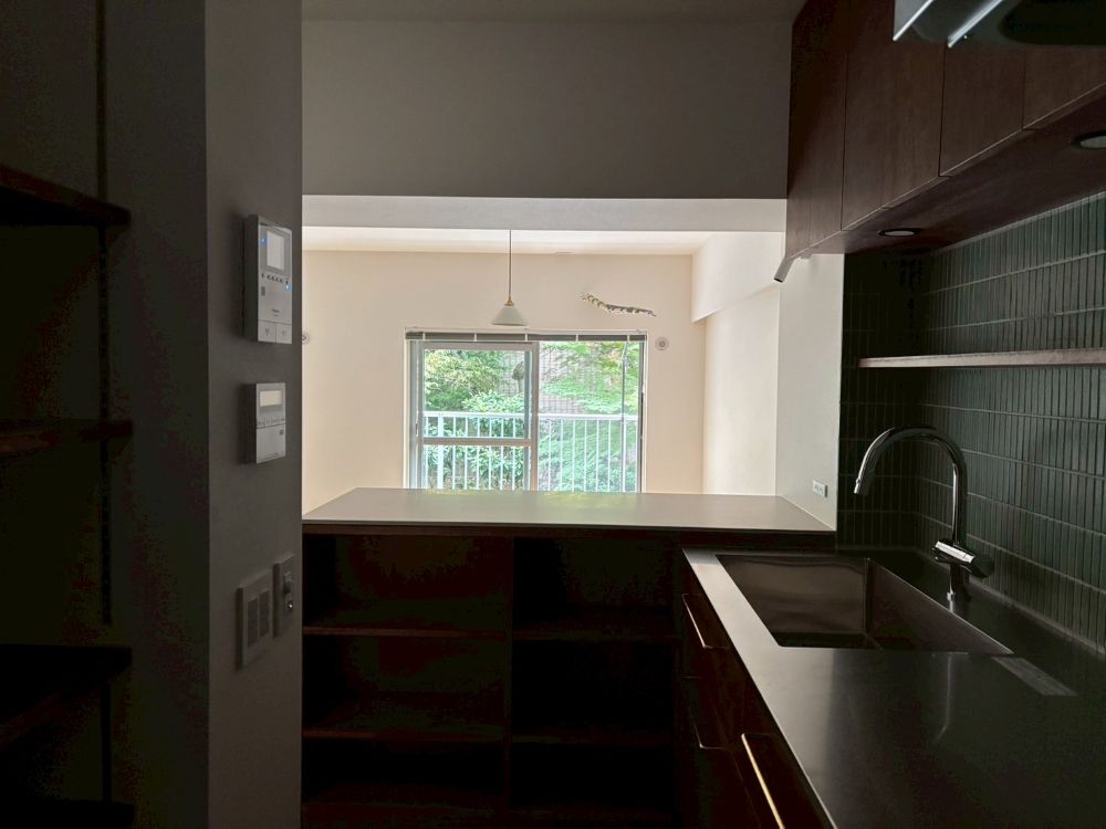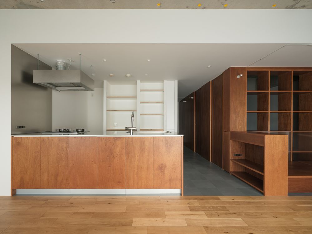棚板が梁を受け止めるように走ることで、梁の存在そのものを、空間の一部として整えています。
