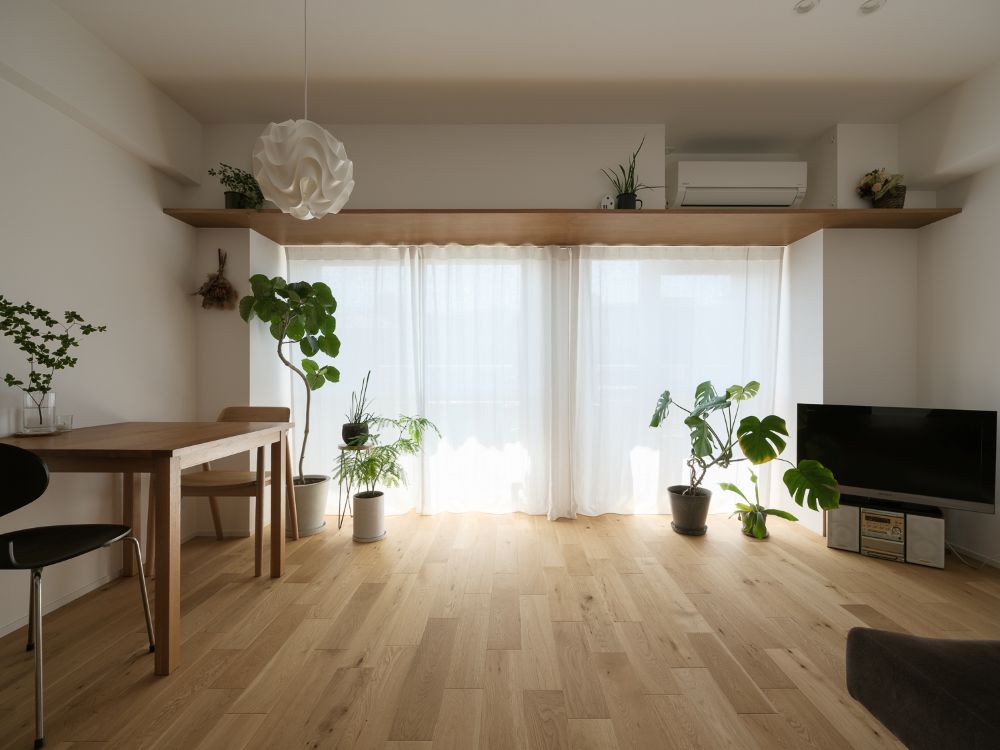 リビングの窓際では、梁の下面に合わせて棚板を通し、その上部にエアコンを配置。