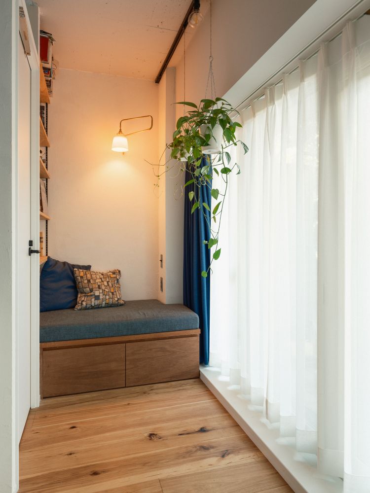 窓際の一角には、小さなヌックを設けました。三方向を壁に囲われ、リビングに向かって開く、静かな居場所です。