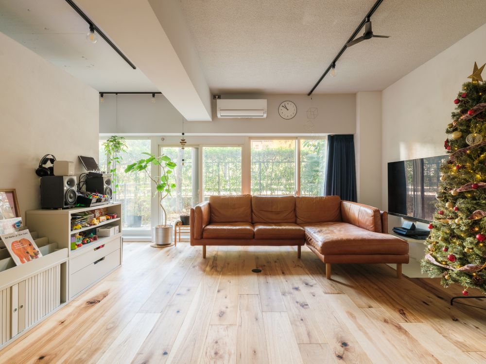 床材にはヒッコリー材を採用しました。窓から差し込む光をやわらかく受け止めながら、力強い木目が空間に穏やかな表情を与えます。