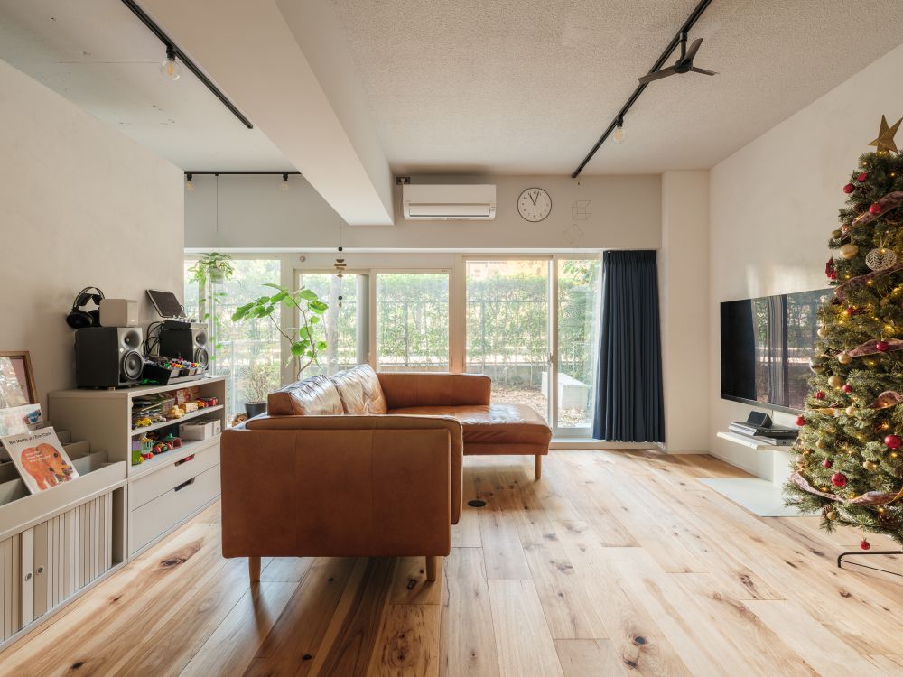 都内では珍しい、専用庭を備えたマンション1階住戸のリノベーションをご依頼いただきました。既存住戸では和室によって開口の間口が半分に分断されており、庭の存在を十分に活かしきれていませんでした。