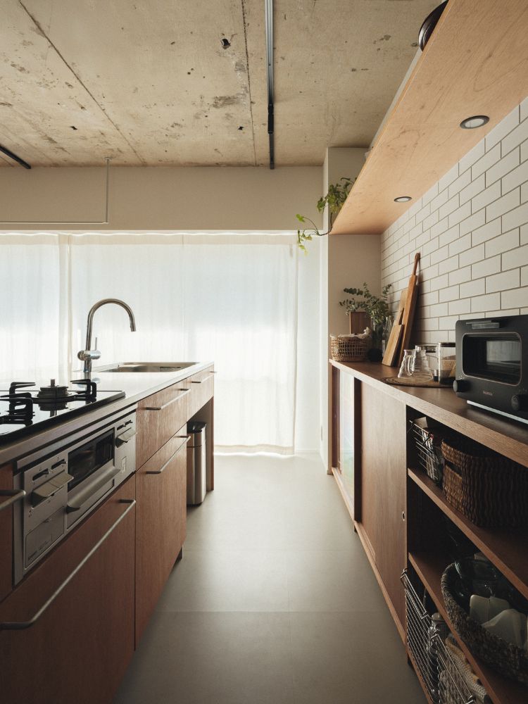 特に印象的なのが、お施主様が所有していたテーブルの奥行きを基準に設えた造作のアイランド型調理台です。ラワン材と人工大理石で仕上げた天板は、使い勝手と美しさを両立。ダイニングと一体化することで、全長3メートルを超えるフレキシブルな大きな作業台を空間の中心に据えました。