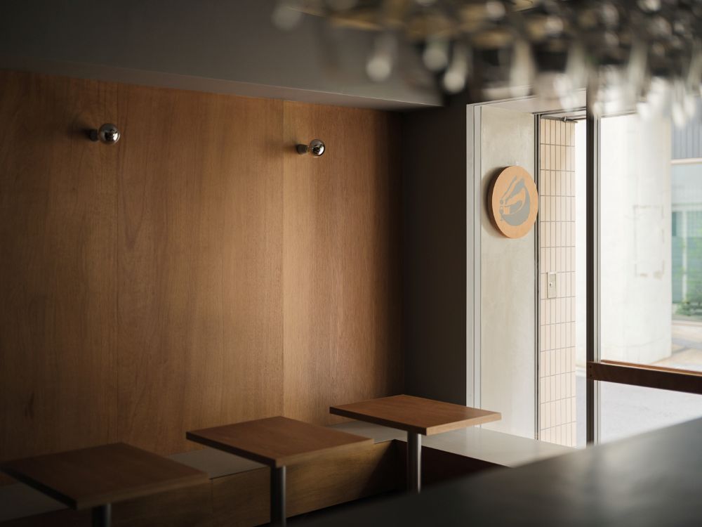 その対面には、ラワン材仕上げの壁を設け、梁上部に間接照明を仕込むことで、空間がまっすぐに伸びていく印象を演出。