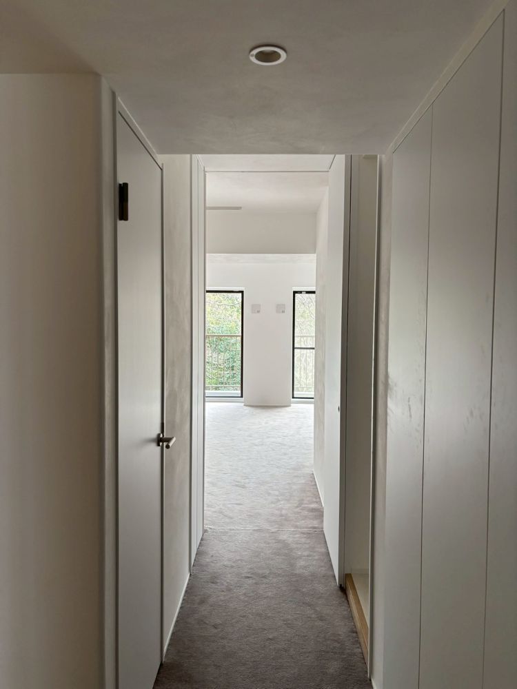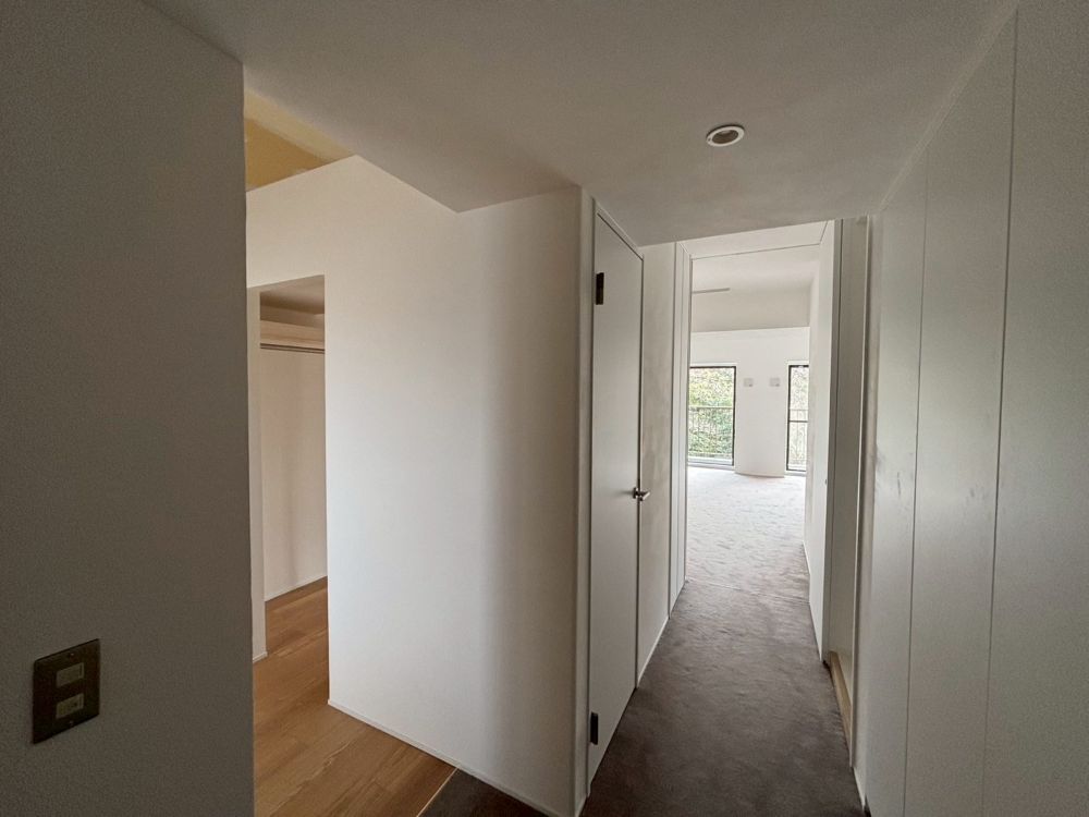 室内では、その光をできるだけ廊下側にも取り込むために、建具の高さを天井まで伸ばしたガラス建具を採用しました。空間の奥まで光が回り込み、住まい全体に柔らかな明るさが広がります。