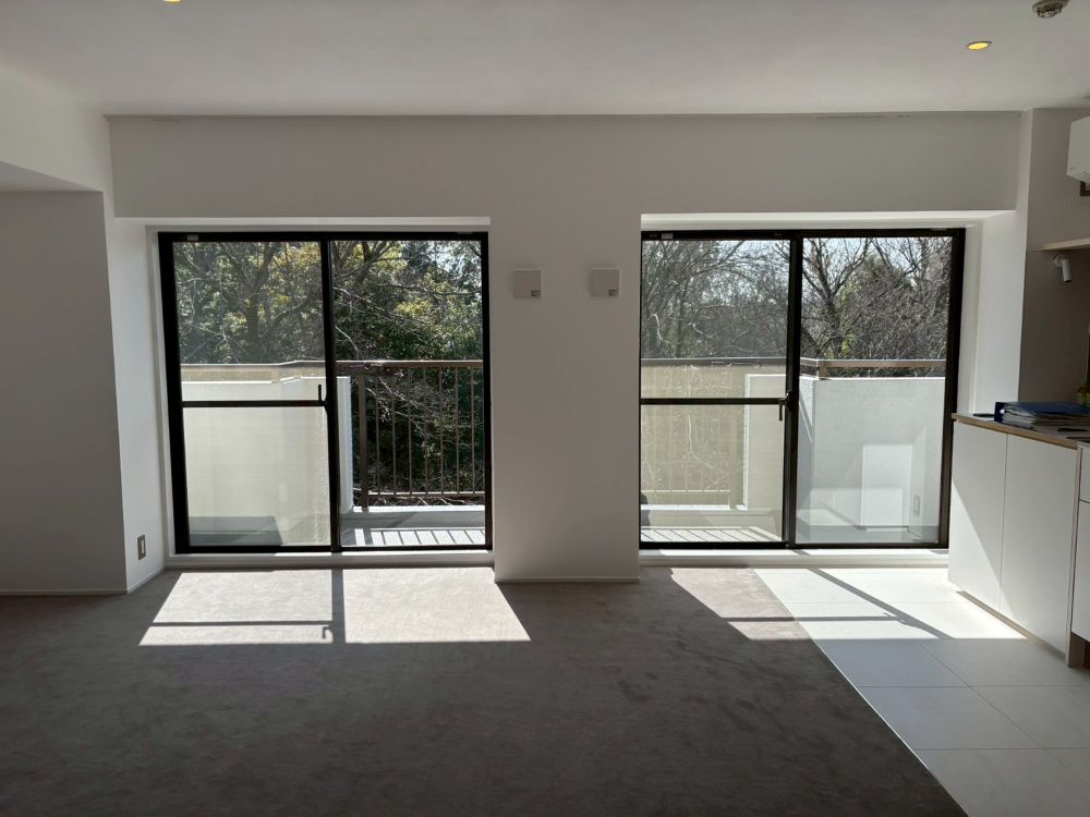 周囲には高い建物が少なく、緑の上には空が広がります。近くの緑と空の抜けが重なり、静かで落ち着いた景色が室内に取り込まれます。