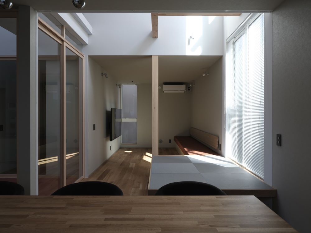 南東に面したL型のリビングダイニング空間は、家族の中心となるスペースです。朝は、小上がりとダイニング側の窓から朝日が差し込み、光庭の白塗装が陽の光を優しく反射します。